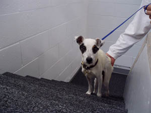We also used a wobble board as balancing helps stimulate the pathways between her brain and her body so that they can reactivate after her long illness and paralysis. She had tiny rails to jump over to work on eye/paw coordination. The muscles in her rear legs were wasted away so we worked on exercises to gently build them back up, and to help her with her coordination...a ramp for her to walk up, small rails to jump over and the therapeutic stairs; big steps on one side, small on the other with a place for a helper to assist. She was very proud of herself the first time she reached the top!